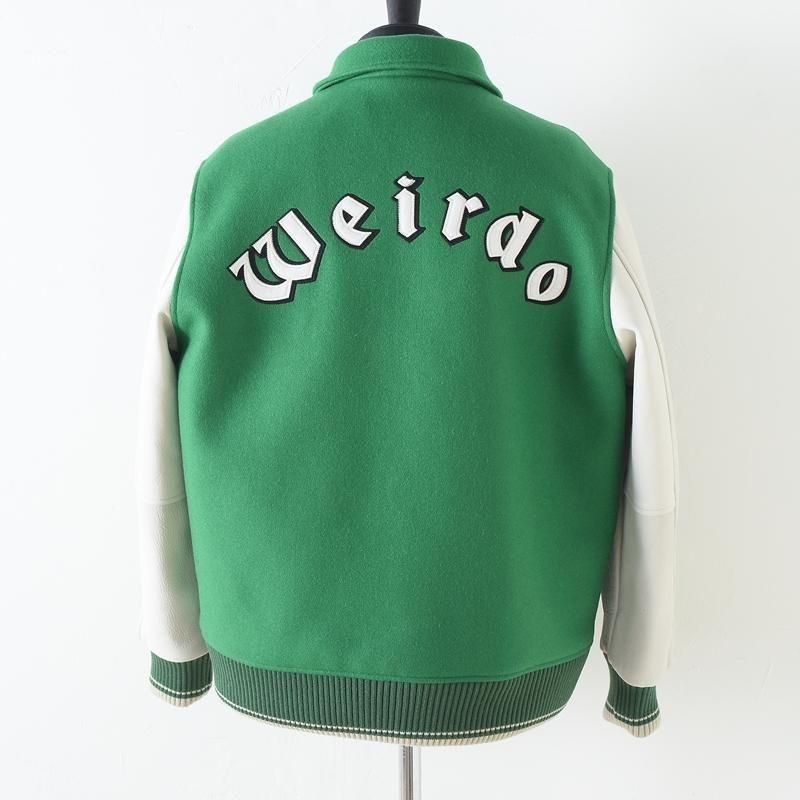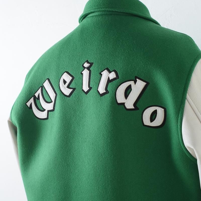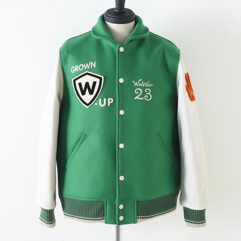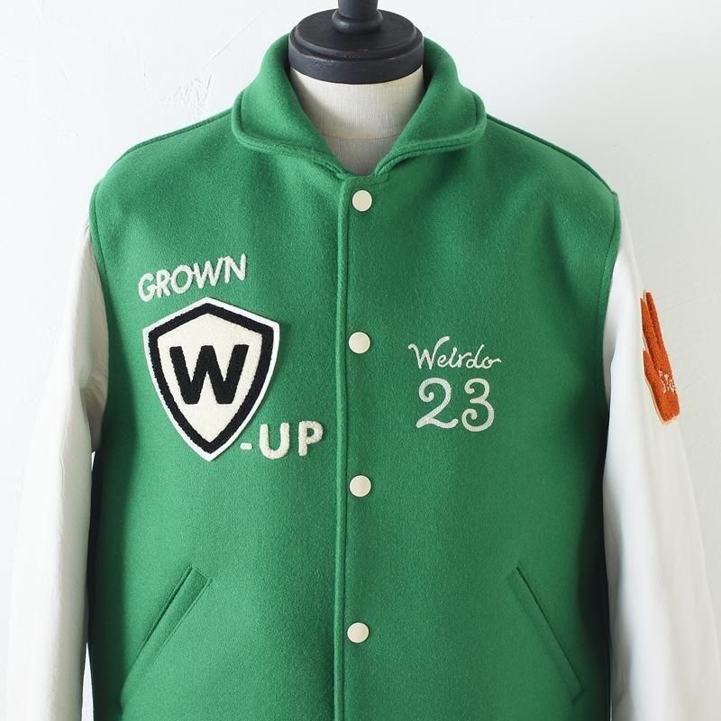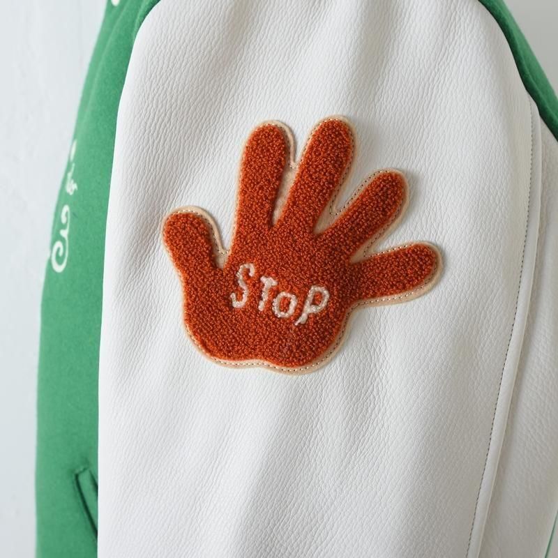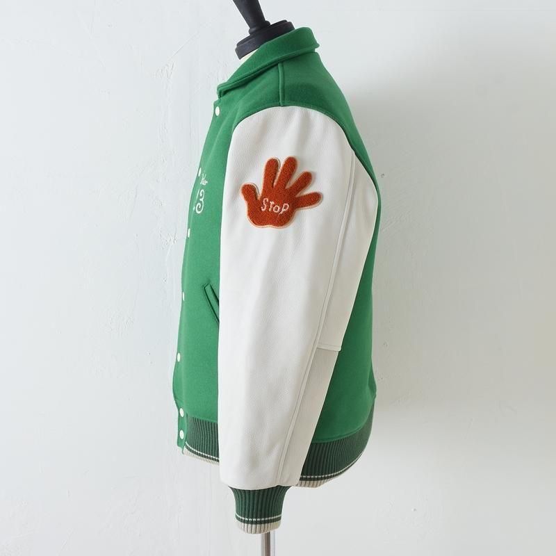 ラウンド衿が特徴的なスタジアムジャケットで、胸、背中、腕に配された